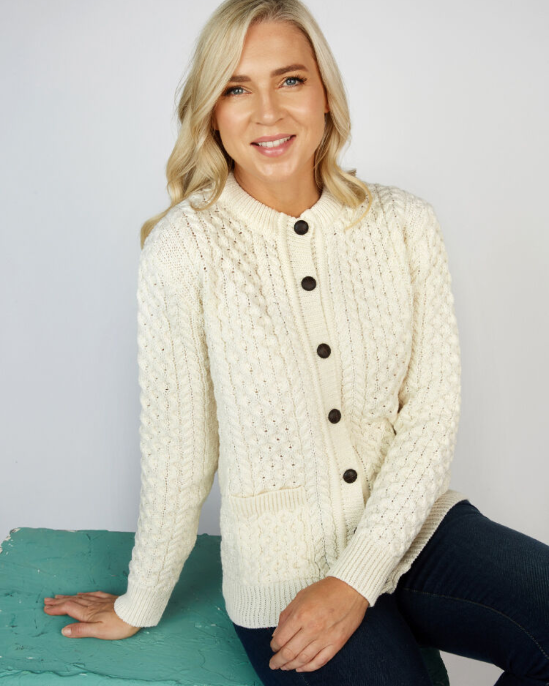 Prezintă emblematicul model cu împletituri Aran pe partea frontală și posterioară completat de nasturi eleganți care permit purtarea jachetei închisă sau deschisă în funcție de ocazie De asemenea dispune de două buzunare frontale practice care adaugă funcționalitate și o notă de sofisticare modernă siluetei sale atemporale